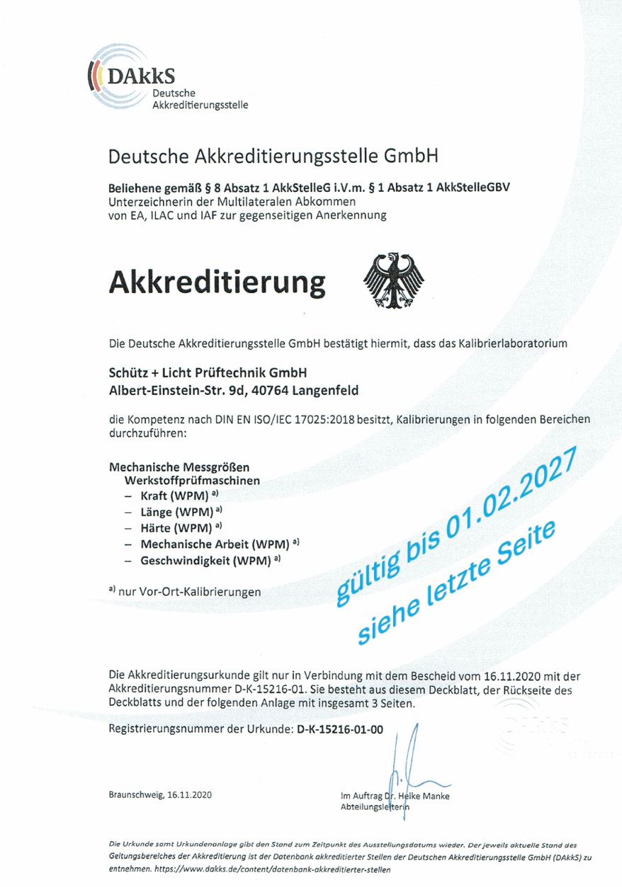 In der Praxis bedeutet das, dass Kalibrierungen durch entsprechend akkreditierte Labore durchgeführt werden müssen. SCHÜTZ+LICHT ist als DAkkS-akkreditiertes Kalibrierlabor auf die normkonforme Kalibrierung von Werkstoffprüfmaschinen spezialisiert.