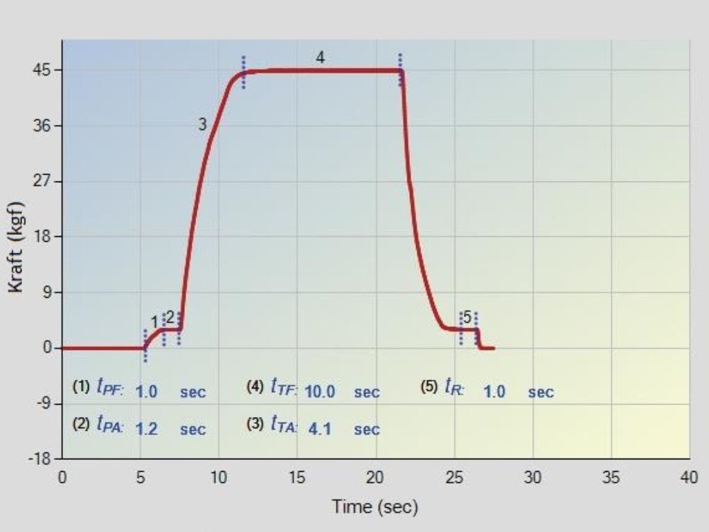 Prüfzyklus Vollautomatisch | Prüfstück-Kontakt, Vorlast, Haltezeit Hauptlast, Entlastung auf Vorlast, Messwertermittlung, Entlastung | |