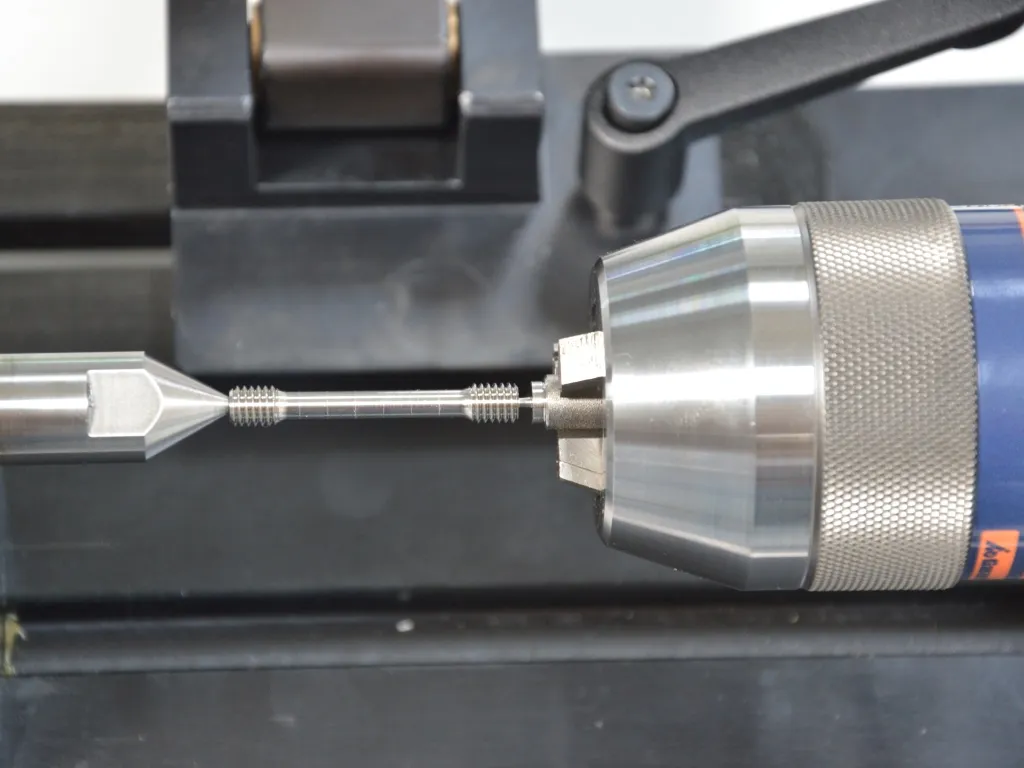 Die Probe bzw. der Kopf der Zugprobe (Zylinderkopf, Schulterkopf, Gewindekopf – andere auf Anfrage) wird einseitig in das Schnellspannfutter aufgenommen. Auf der Gegenseite befindet sich ein federnd gelagerter Zentrierdorn. Bei den auf einer Drehbank gefertigten Proben ist in der Regel mindestens an einem Ende der Zugprobe eine Zentrierbohrung vorhanden. Diese ist erforderlich für die auf der linken Seite verbaute Zentrierspitze.