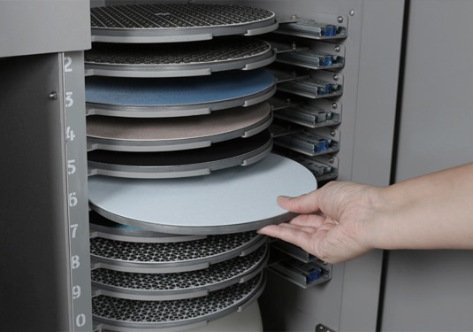 Im integrierten Stauraum lassen sich bis zu zwölf vorbereitete Probenhalter bevorraten (für Einzel- oder Zentralkraft), jeweils bestückt mit sechs eingebetteten Proben. Die Bedienung des Systems beschränkt sich auf den sekundenschnellen Wechsel der Probenhalter und den Start der automatischen Schleif- und Poliervorgänge.