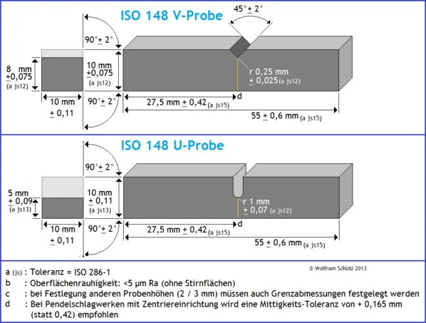 Probenmaße / Probendimensionen von Kerbschlagbiegeproben gemäß ISO148
